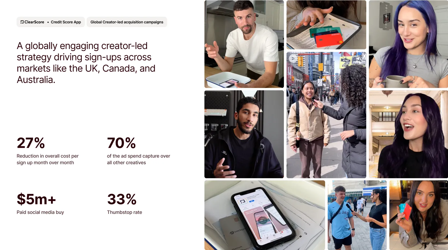 A strong example of inBeat’s impact comes from their global creator-led acquisition campaign for ClearScore across the UK, Canada, and Australia.