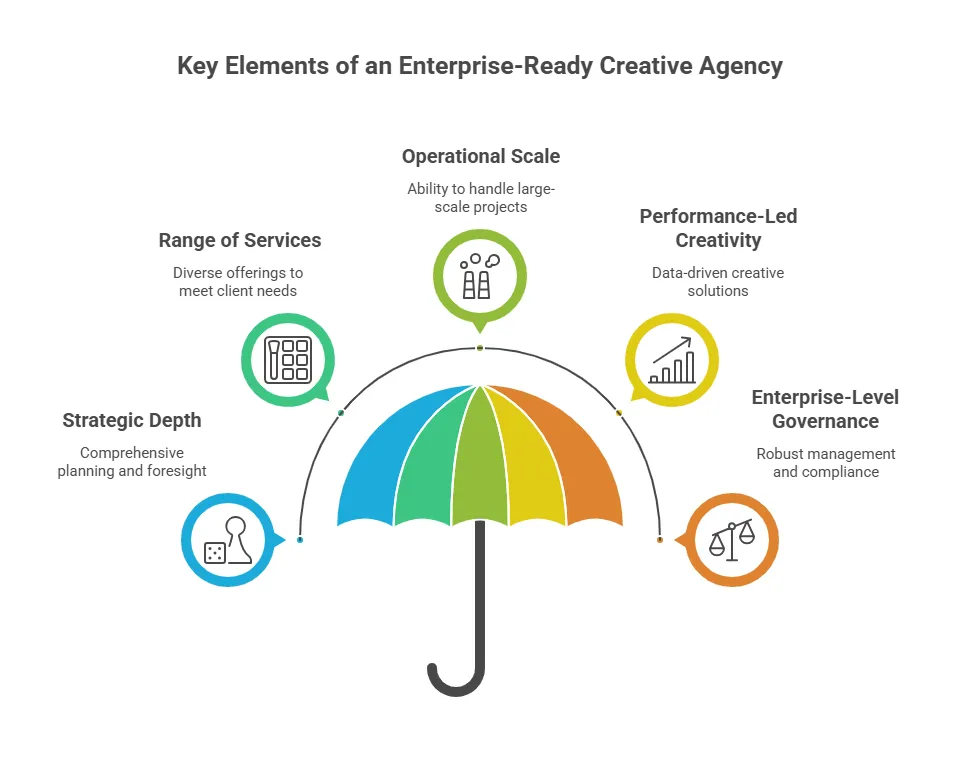An enterprise-ready creative agency combines strategic depth, broad capabilities, and standardized processes to meet the scale, complexity, and expectations found in a typical high-performing agency and client relationship.