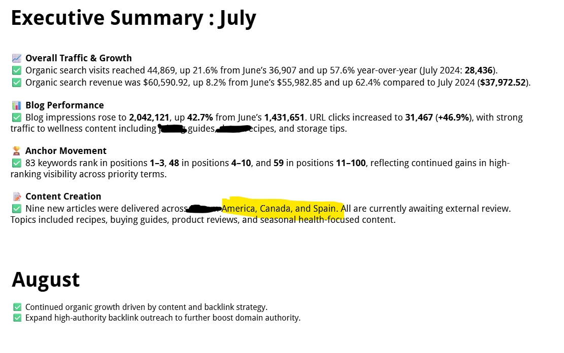 As you can see, for SEO, we track organic search visits with YoY and MoM growth. And yes, we produce separate content for three different markets.