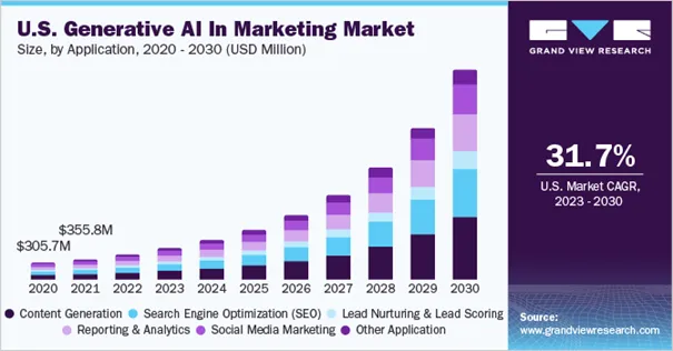 CMOs shape how a company experiments with new ideas and technologies. They’re actually deciding where to bet on disruptive tech. The U.S. generative AI in marketing market is growing at 31.7% CAGR through 2030, and leaders who move early are already seeing advantages.