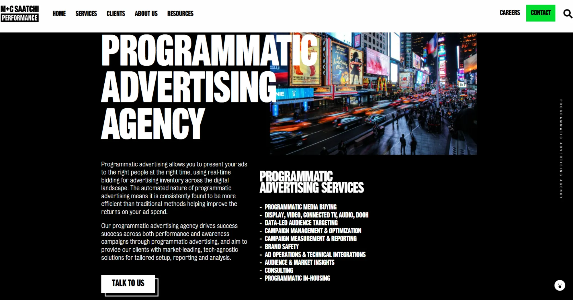 M+C Saatchi Performance builds programmatic campaigns that balance brand visibility with performance results, running across display, video, connected TV, audio, and DOOH with tech-agnostic bidding.